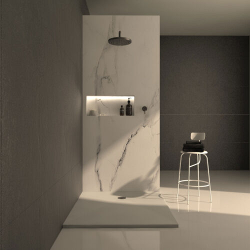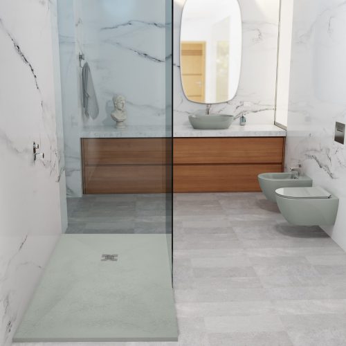 E se, de repente, numa simplicidade única de linhas, o seu banho insistir numa união perfeita… Num discreto prolongamento do seu chão interrompidamente continuado.